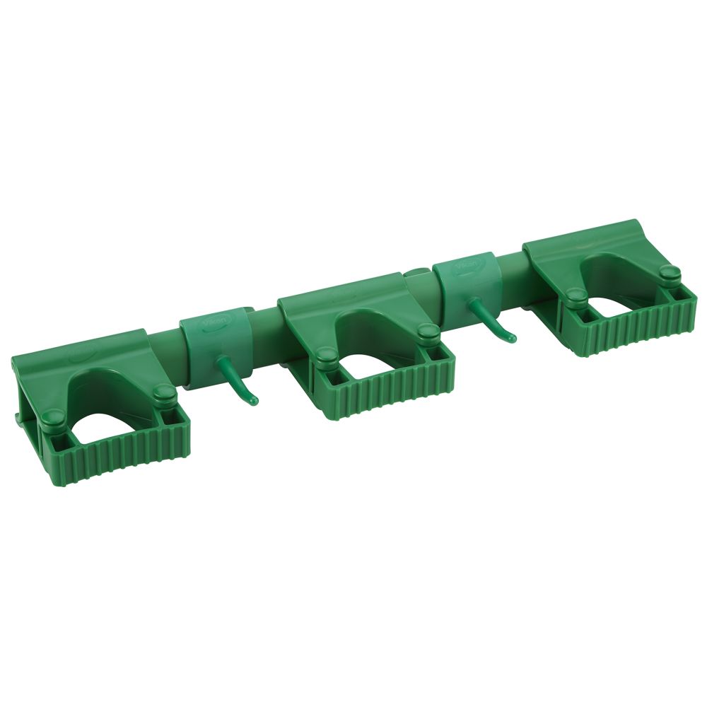 Hygieniskt väggupphäng med en flexibel lösning för förvaring av redskap i alla områden. Uppänget är baserat på moduler. Skenan fästs enkelt på de fyra väggfästena genom att skjutas på från sidan. Gummibandshållare och krokar klickas därefter fast på skenan, små klackar i konstruktionen säkerställer att de inte kan glida i sidled. Skenans kapacitet är 1-10 moduler, max 5 gummibandshållare/ 10 krokar. Gummibandshållarna håller redskap med en diameter på 28-33 mm. Krokarna klarar en vikt på upp till 3 kg. Hållaren levereras med 3 gummibandshållare och 2 krokar. Modulerna är lätta att demontera/ montera vid rengöring och byte.