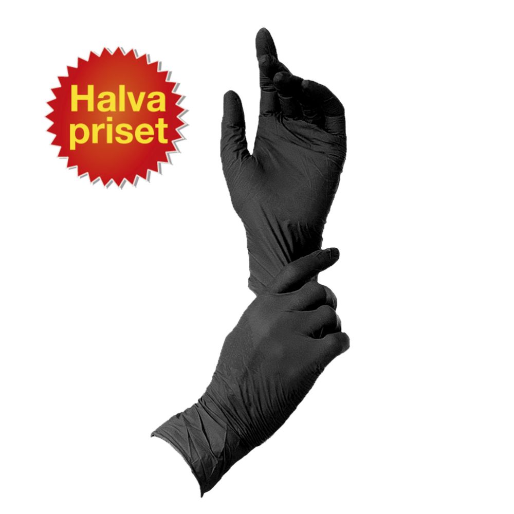 BESKRIVNING: Denna modell av handske är gjord av nitril och är i mycket bra kvalitet. Känsligheten är högre eftersom handen har bättre grepp oavsett om handsken är våt eller torr. Den har en upprullad manschett med förstärkning som gör att den är lätt att ta av och på. Handsken kan användas ett flertalgåner eller under en hel dag. Materialet ger ett bättre skydd än handskar gjorda av andra material. OBS Bäst före datum har gått ut på dessa handskarna!